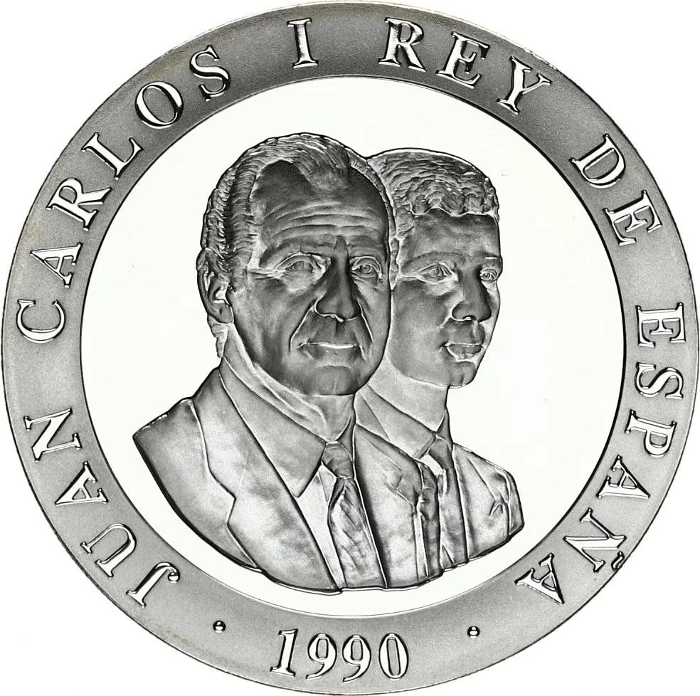 Conjoined busts of Juan Carlos I and Felipe facing right.