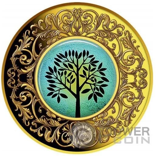 Tree in circle, framed by leaves.
