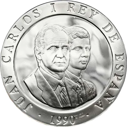 Conjoined busts of Juan Carlos I and Felipe facing right.