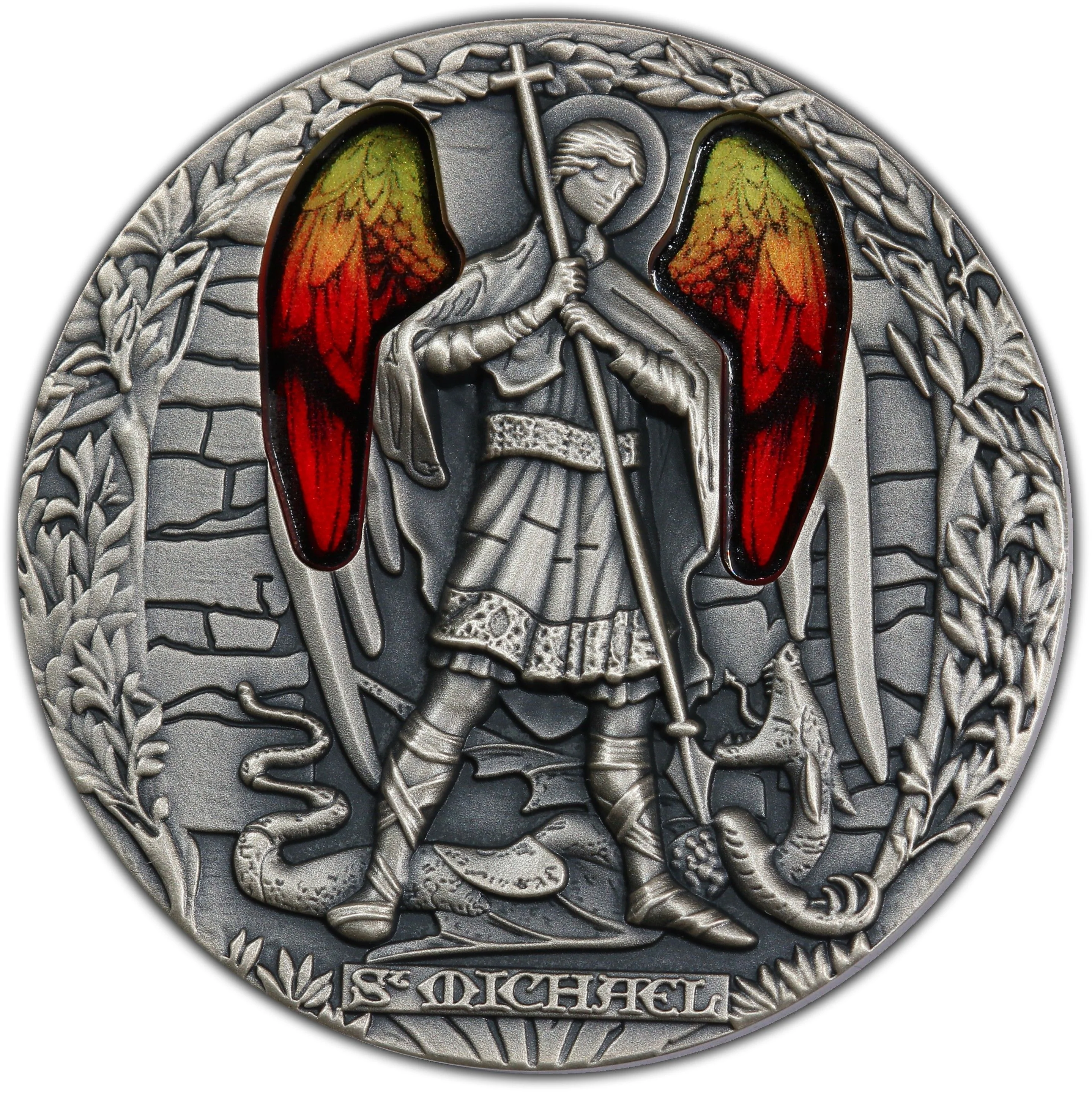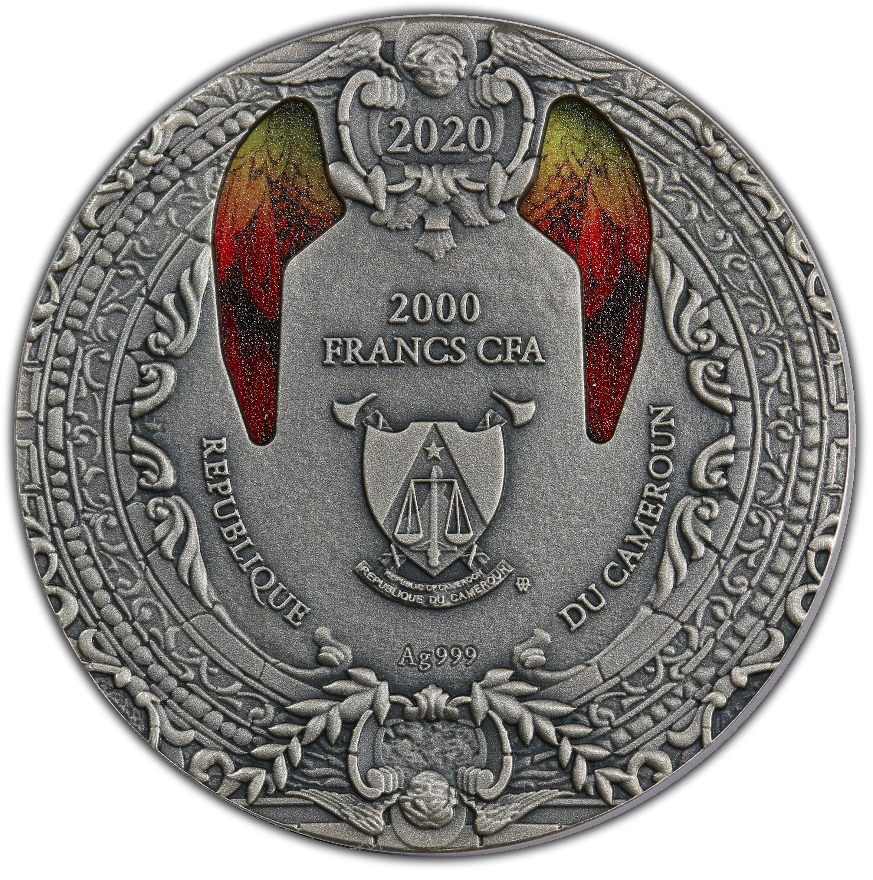 Description: Colored glass wings above Cameroon's coat of arms, with an angel looking down from the top.
