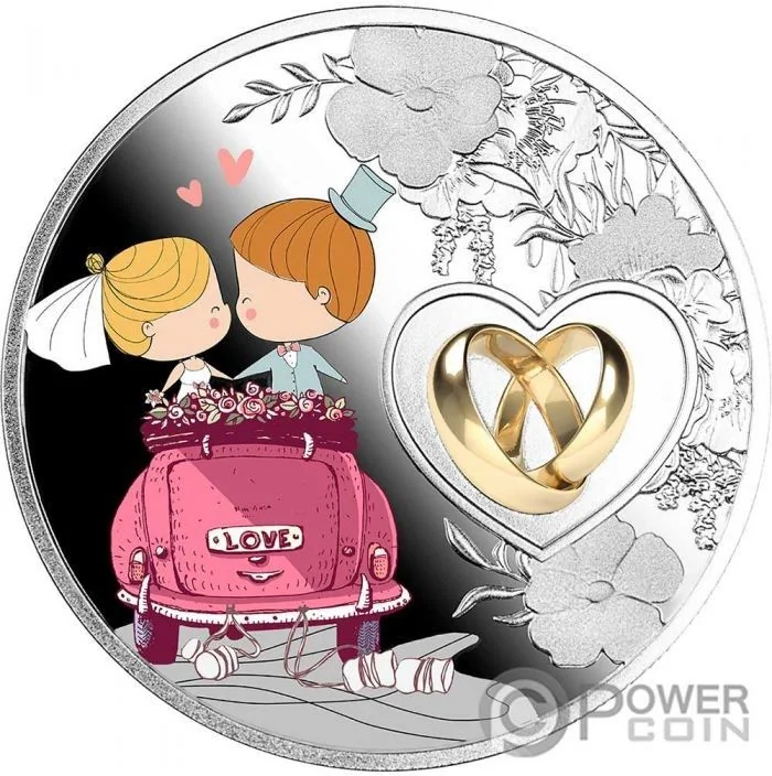 Kissing couple in car, wedding rings in heart.