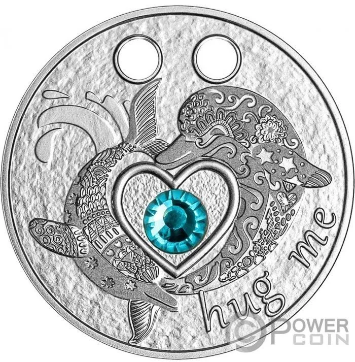 Two dolphins encircling a heart with a blue crystal. Two holes at top.