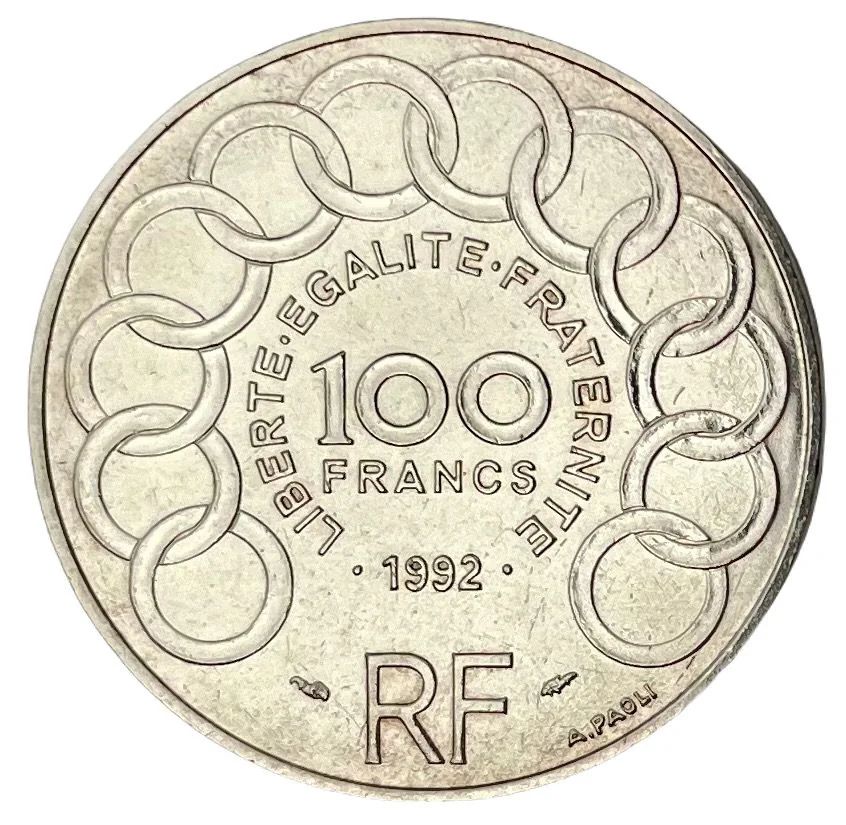A ring of 12 circles along the upper rim frames a central date, with the value and French motto above it and the French monogram below.