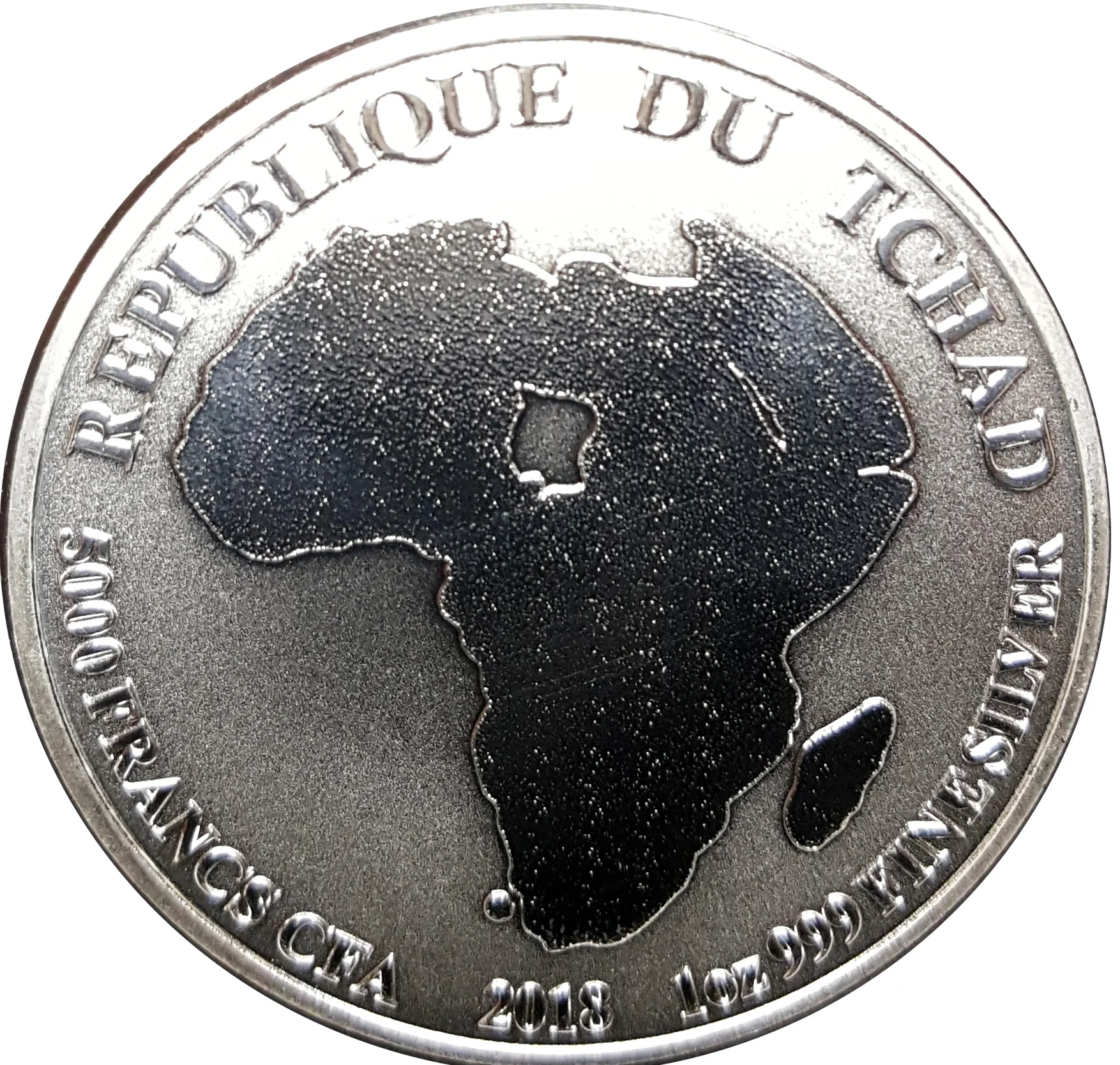 Description: The obverse shows a frosted map of Africa with Chad mirrored, encircled by inscriptions including "REPUBLIQUE DU TCHAD."