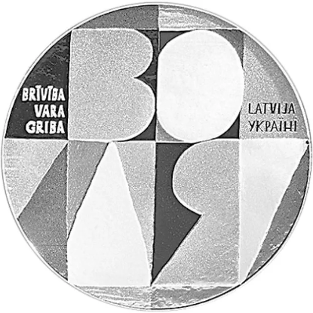 Ukrainian "ВОЛЯ" with varied frosting intensity in two rows; Latvian "BRĪVĪBA VARA GRIBA" top left in three rows; "LATVIJA УКРАÏНI" right in two rows.