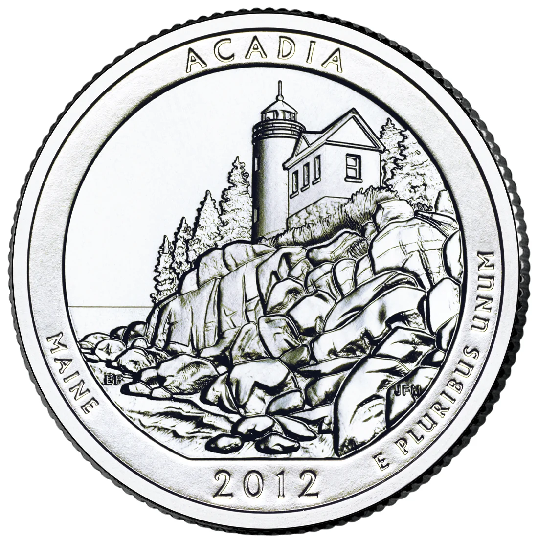 Bass Harbor Head Lighthouse on Acadia's rugged coast. Inscribed: ACADIA, MAINE, 2012 and E PLURIBUS UNUM.