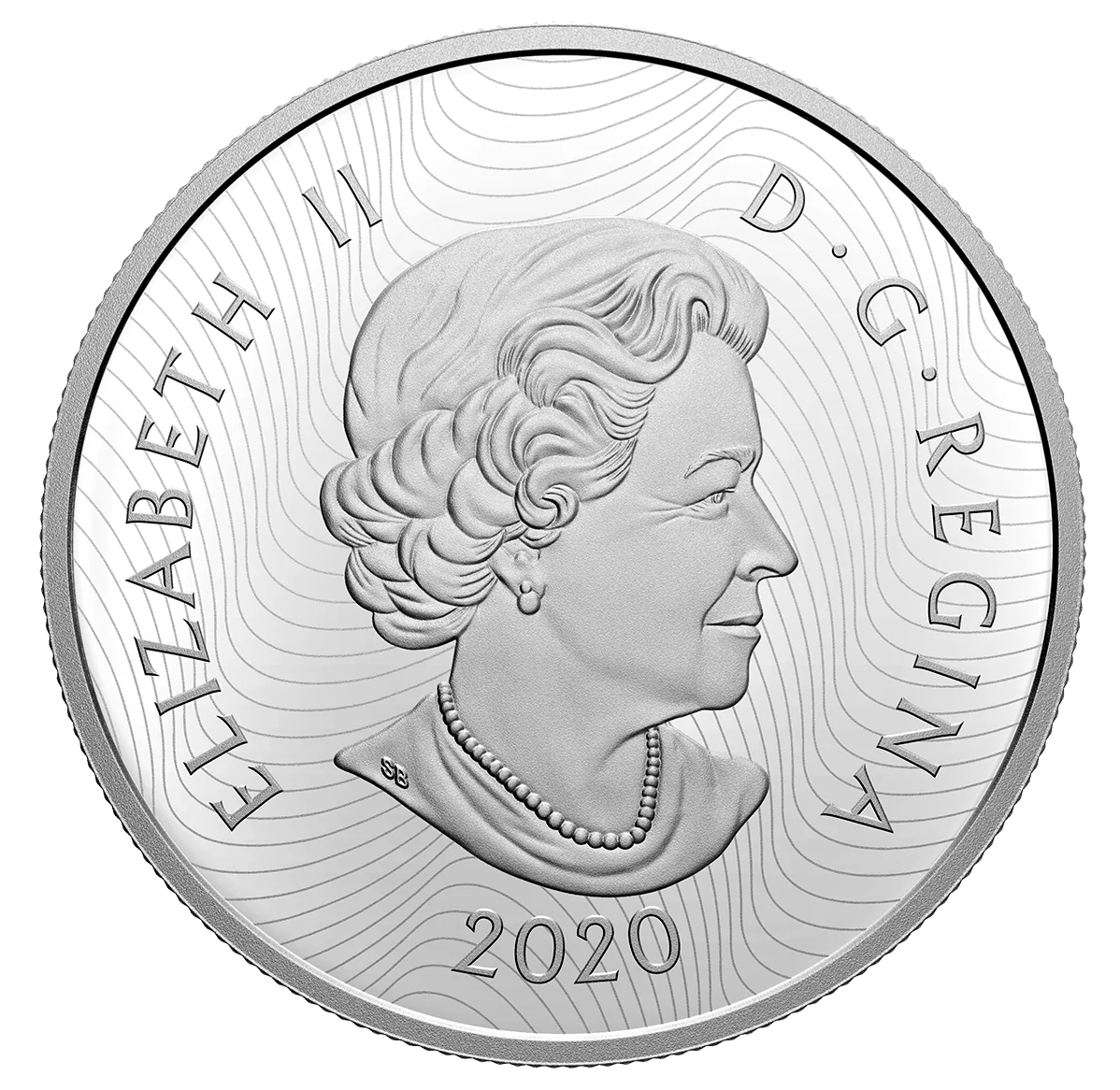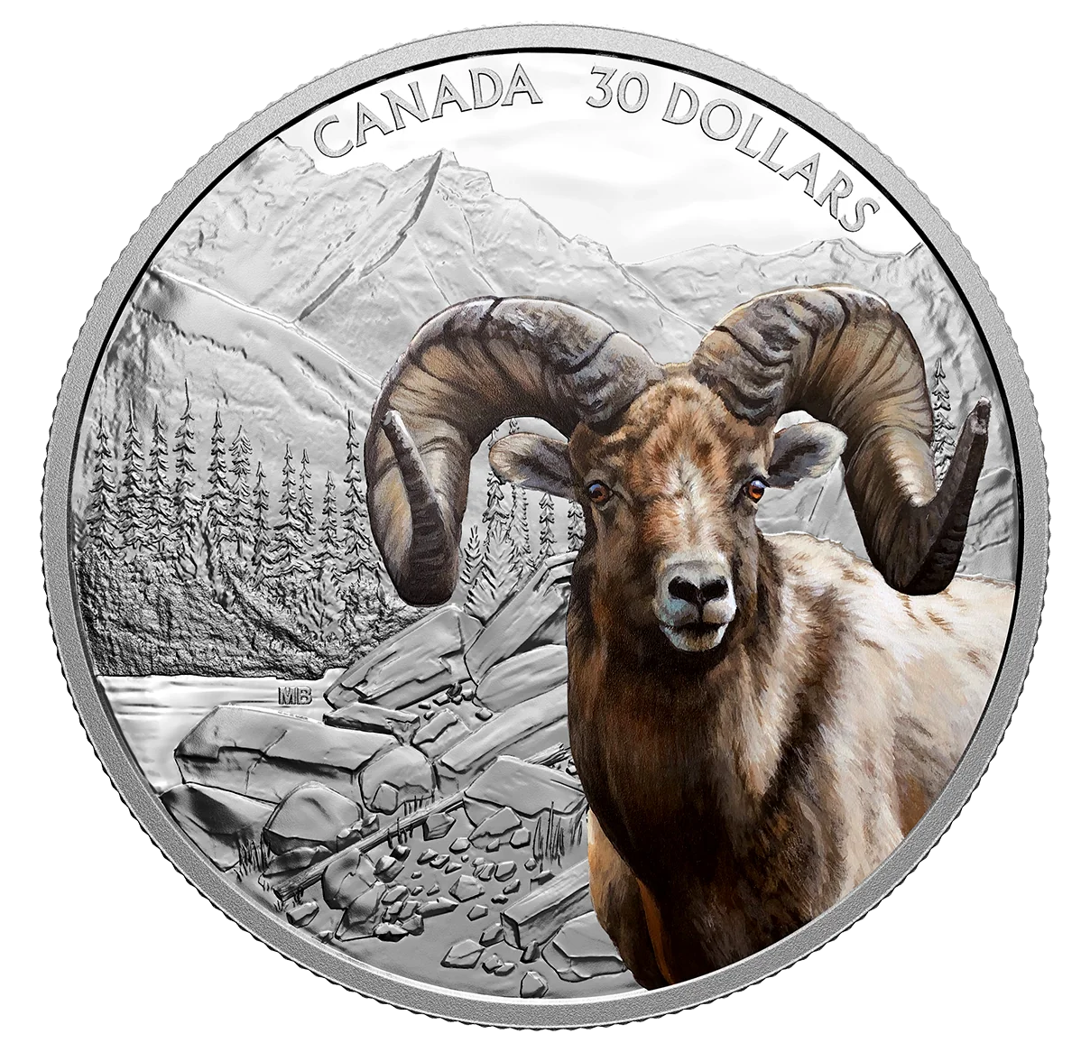 Designed by artist Maurade Baynton, the reverse features a close-up of a Rocky Mountain bighorn sheep, selectively coloured against an engraved backdrop of the Canadian Rockies' peaks and valleys.