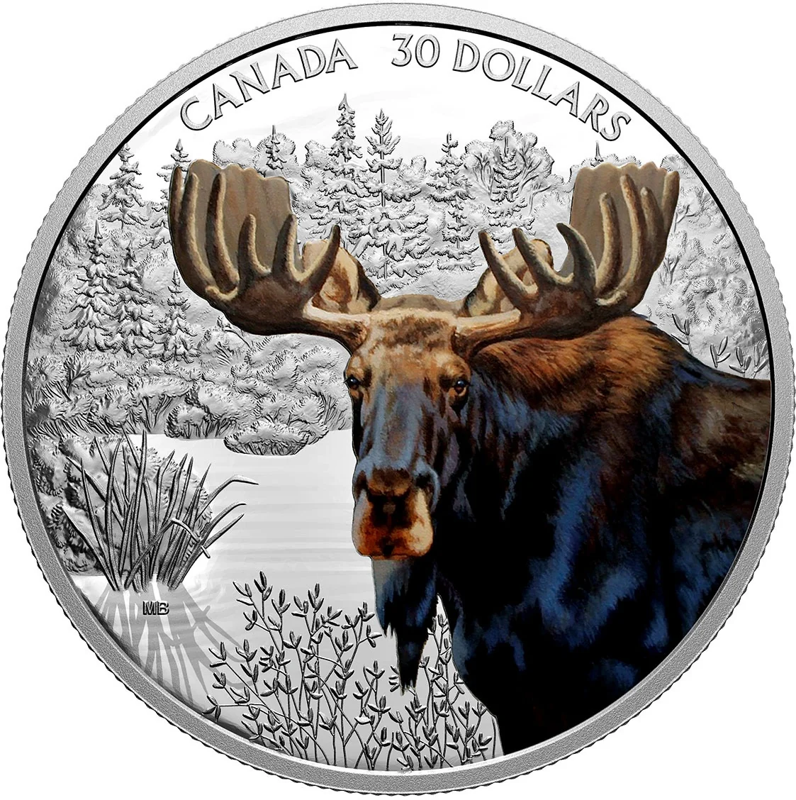 Designed by Maurade Baynton, the reverse features a selectively coloured moose against an engraved backdrop of Canada's boreal forest.