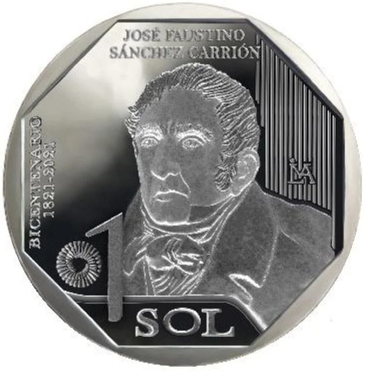 Portrait of José Faustino Sánchez Carrión facing left. Value below, mintmark right.