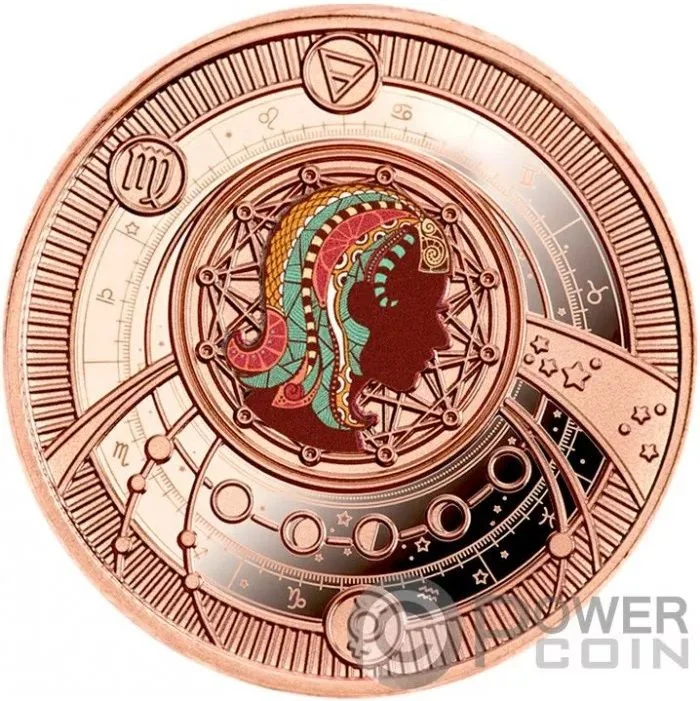 Multicolored woman's head facing right on a disc with zodiac signs and Moon phases.