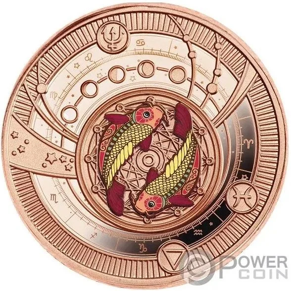 Two fish on a disc with zodiacs and Moon phases.