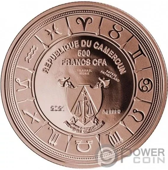 Cameroon's coat of arms encircled by zodiac symbols.