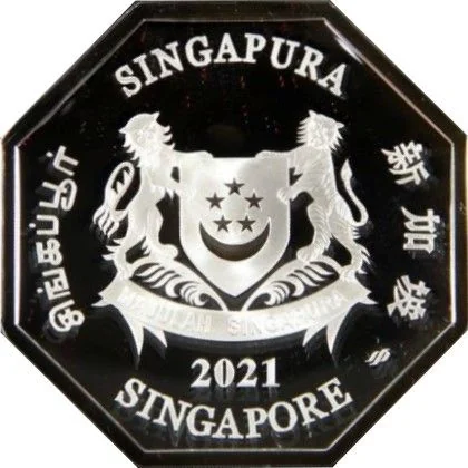 Emblem with date; 'Singapore' encircles it in English, Tamil, Chinese, and Malay.