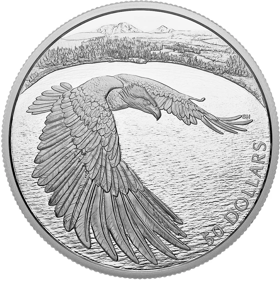 A bald eagle soars powerfully above the coast, its detailed feathers and focused profile drawing the eye over the water to distant mountains. Artist Steve Hepburn's design creates the sensation of soaring alongside the raptor.