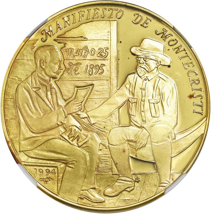 Cuban coat of arms with country name above, face value below, and weight/fineness on the sides.
