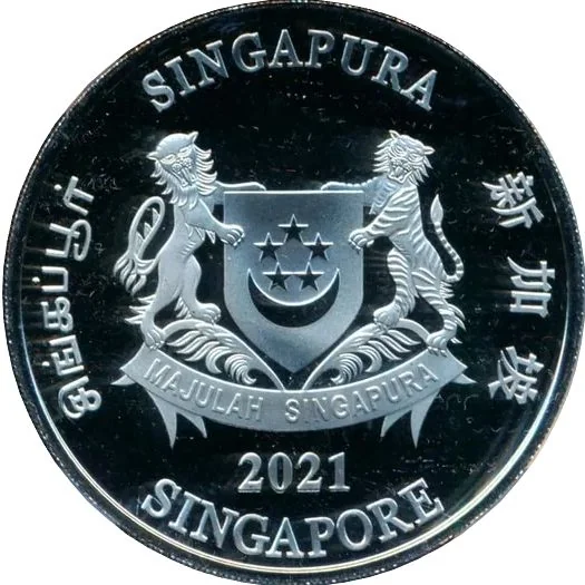Emblem with date; 'Singapore' encircles it in English, Tamil, Chinese, and Malay.