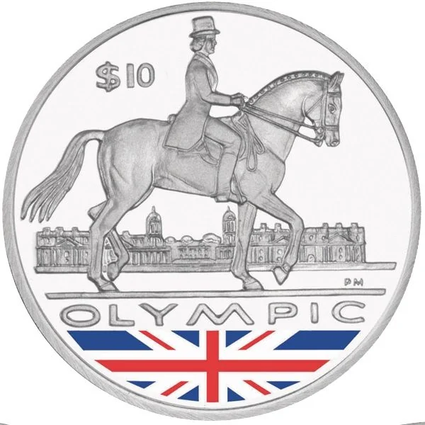 Equestrian dressage with the Old Royal Naval College (housing the National Maritime Museum) and a Union Jack in the background.