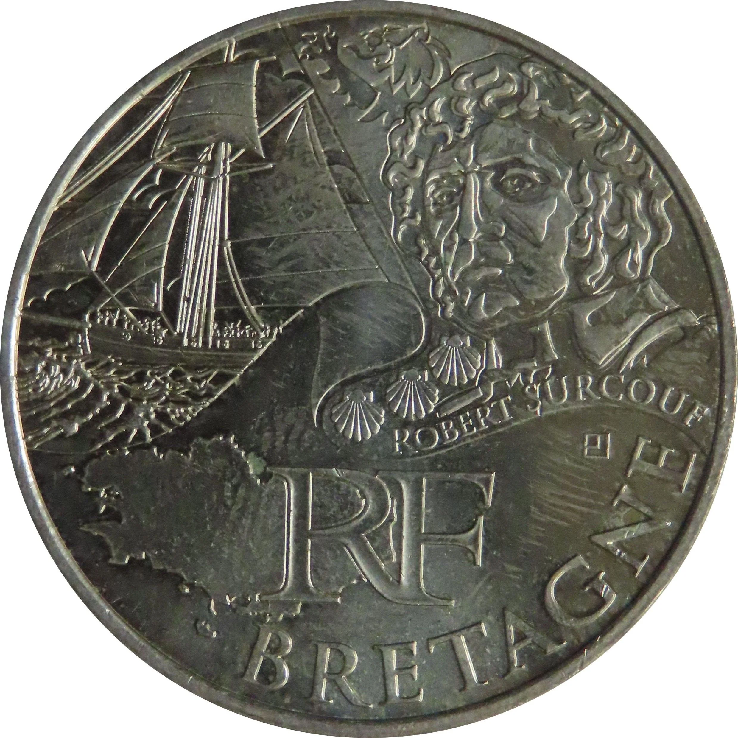 The coin depicts privateer Robert Surcouf and a sailboat beside his name. Below, the outline of Brittany includes "RF" and the region's name on a scroll.