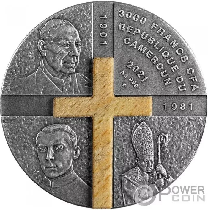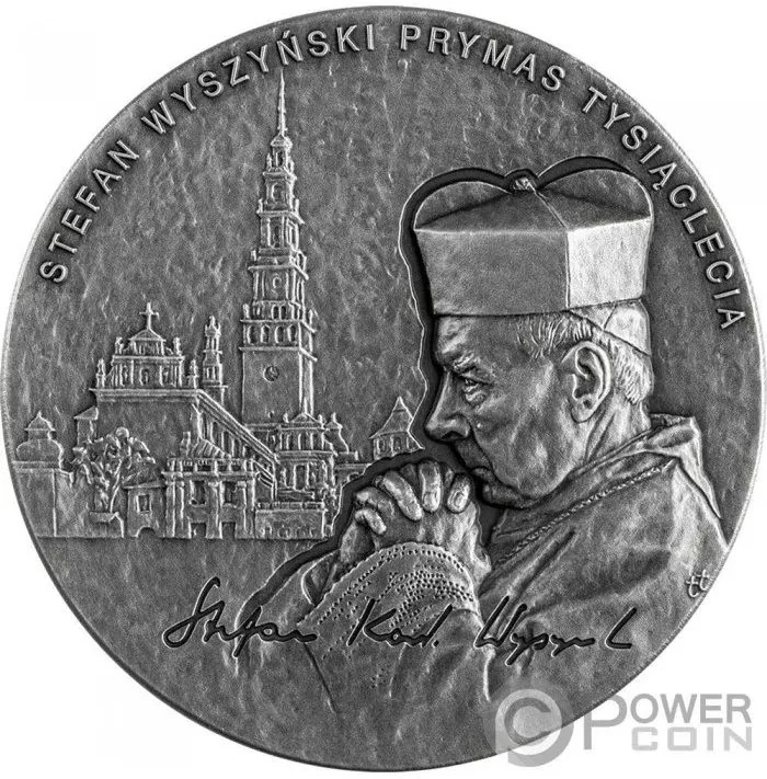 Bust of Stefan Wyszynski facing left, praying hands at right, Jasna Góra Monastery at left.