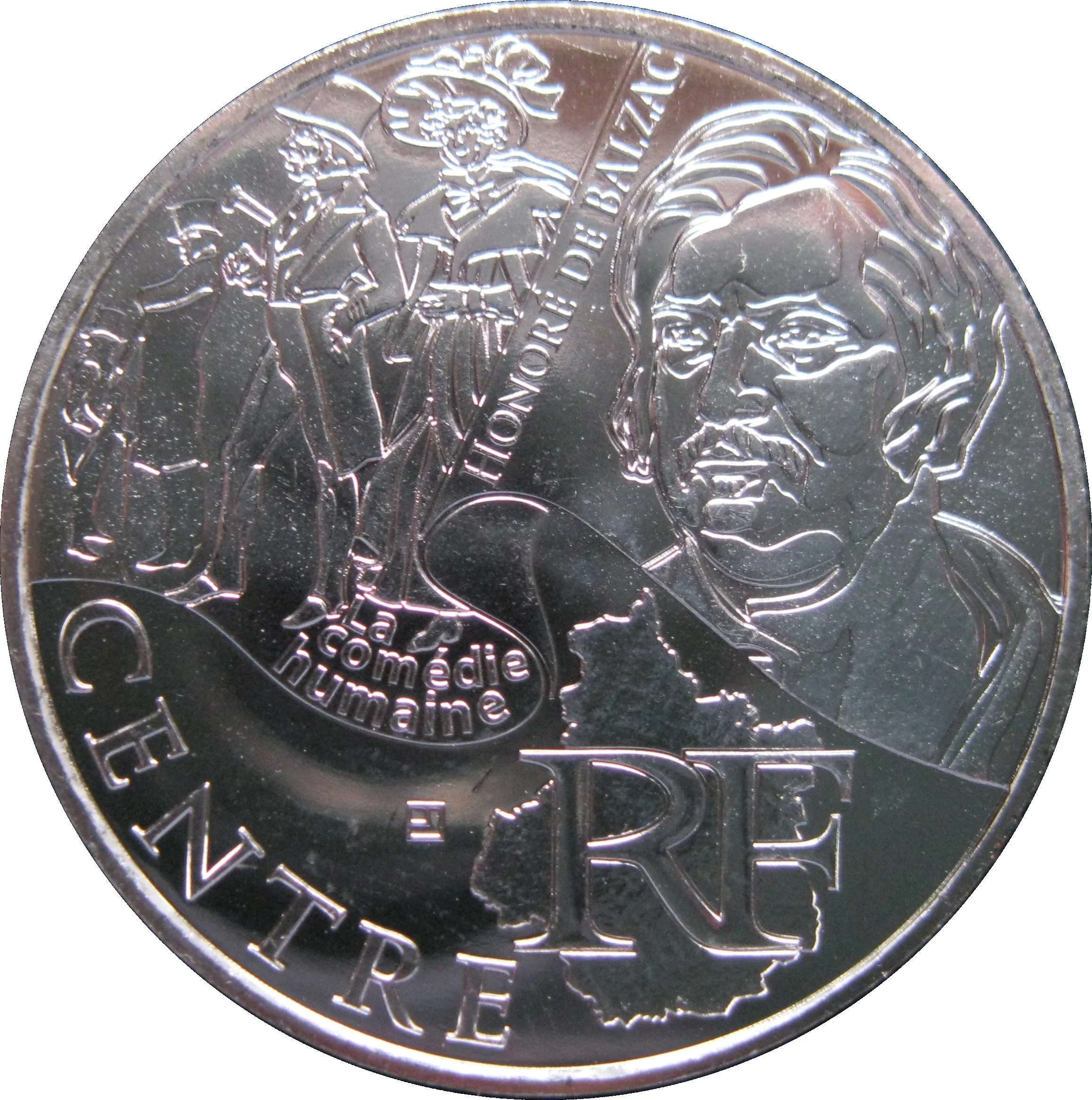 Honoré de Balzac's portrait appears on the right, with his name written vertically beside it. The upper left depicts characters from La Comédie Humaine. Below, the outline of the Centre region is shown with "RF" above it, and the region's name along the listel.