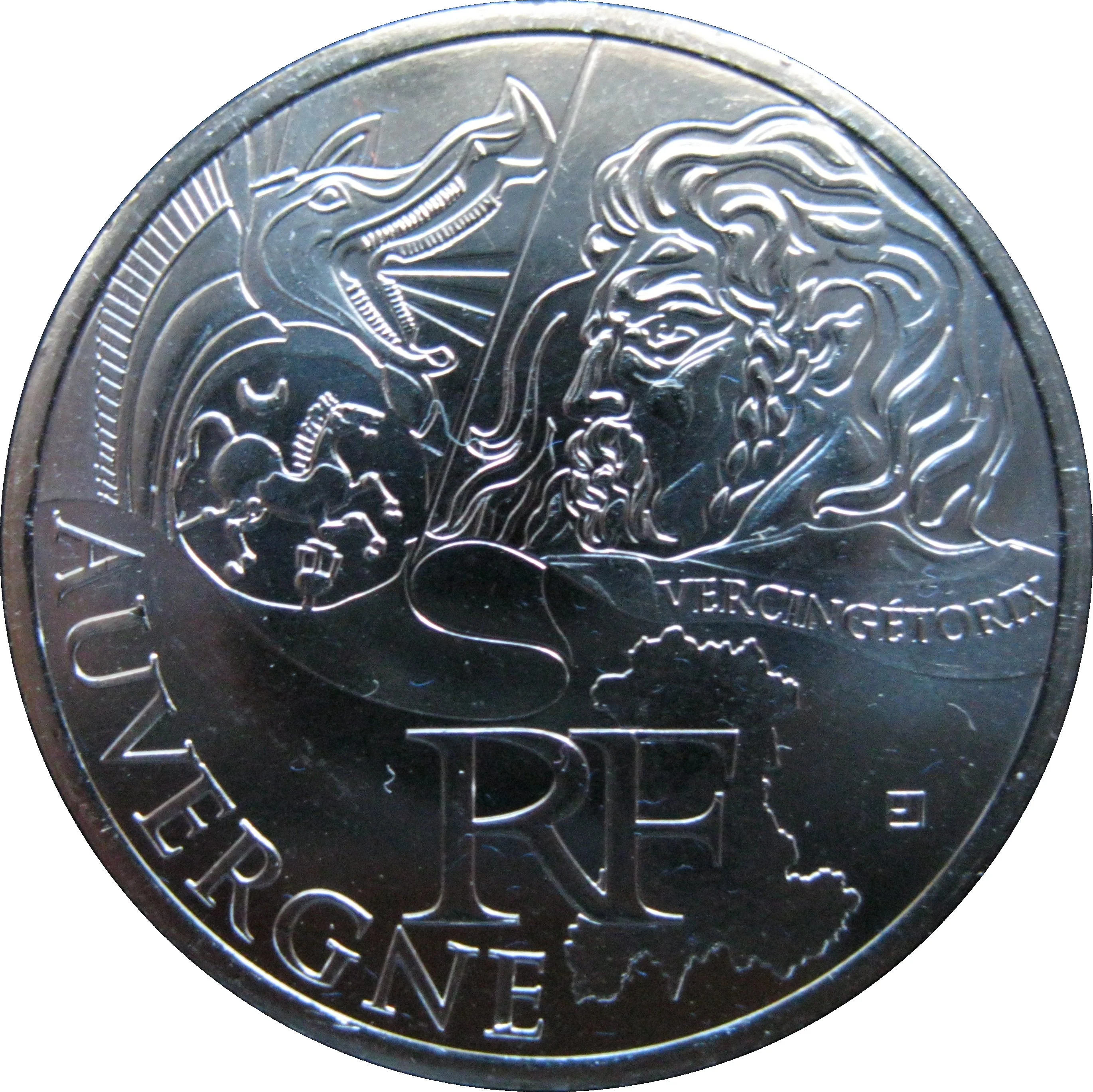 The coin features Vercingetorix's portrait with his name, a carnyx, and the outline of Auvergne marked "RF." The region's name "AUVERGNE" encircles the edge.