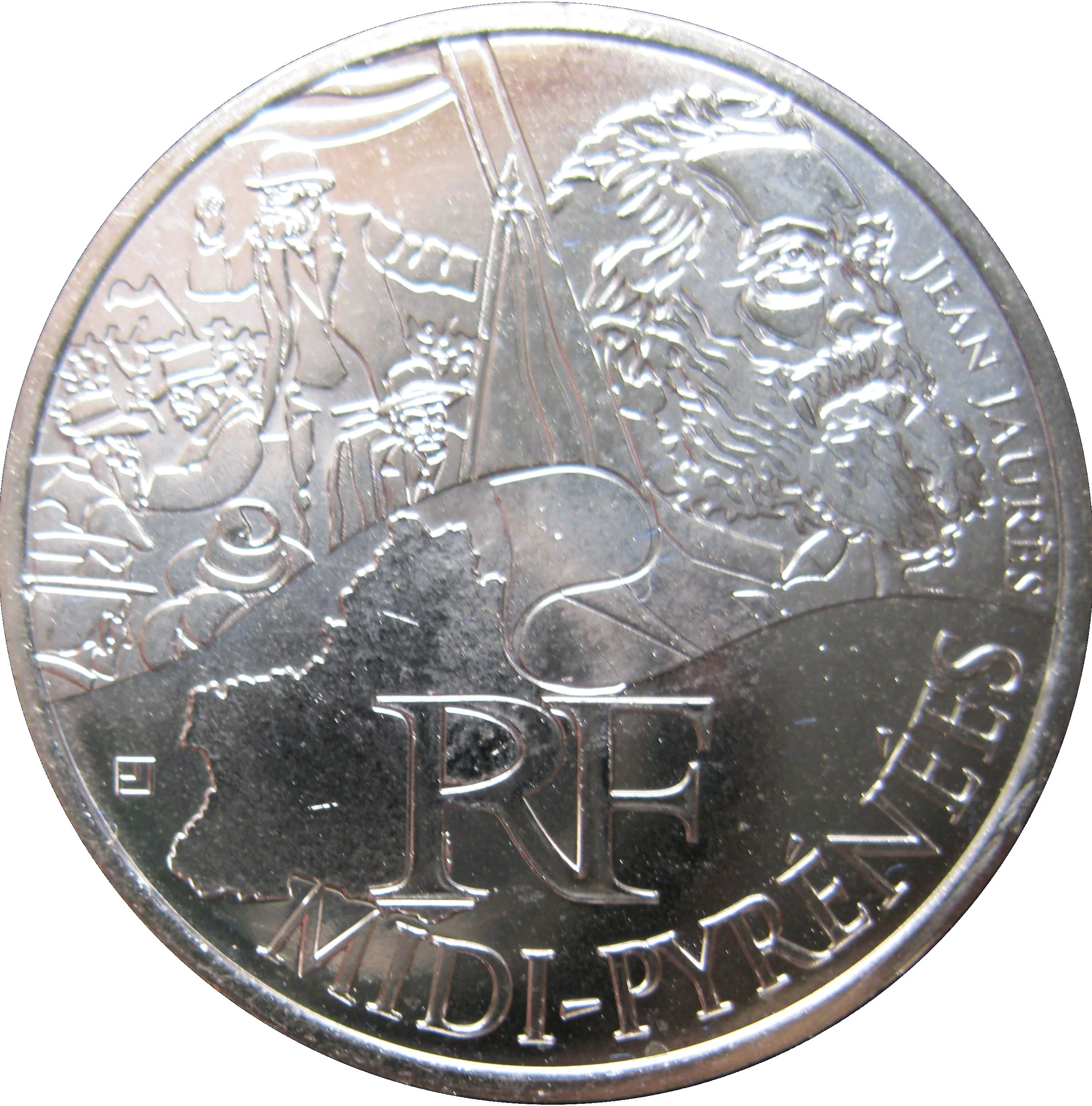The coin features Jean Jaurès, with his name beside his portrait. "Jean Jaurès" in popular speech appears at top left. The outline of Midi-Pyrénées is at bottom, marked "RF," with the region's name along the edge.