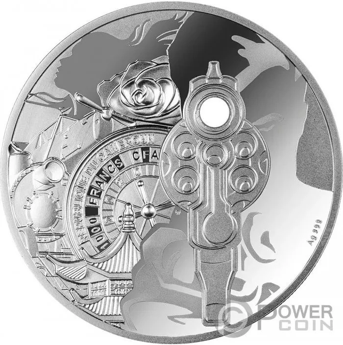 Silhouette with gun, roulette, rose, airplane, and pagoda.