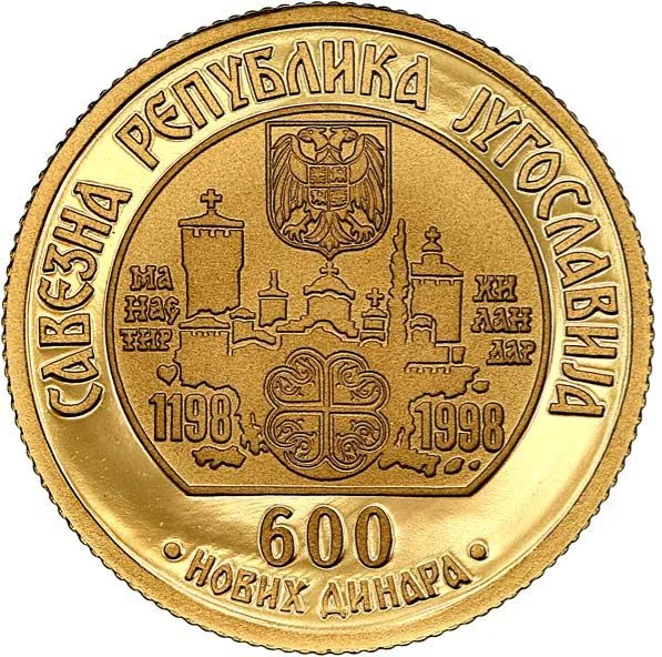 Coat of arms above Chilandar Monastery flanked by anniversary dates, issuer name above, value and date below.