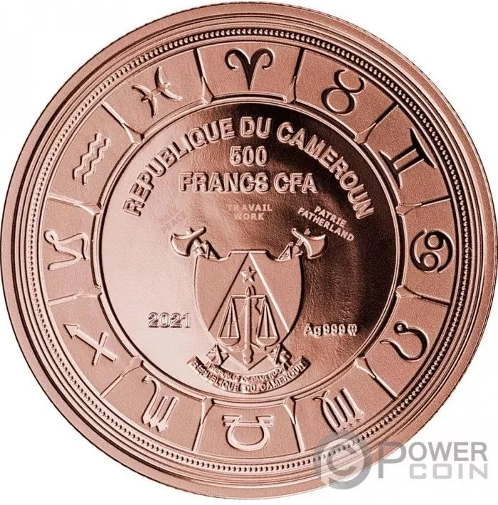 Cameroon's coat of arms encircled by zodiac symbols.
