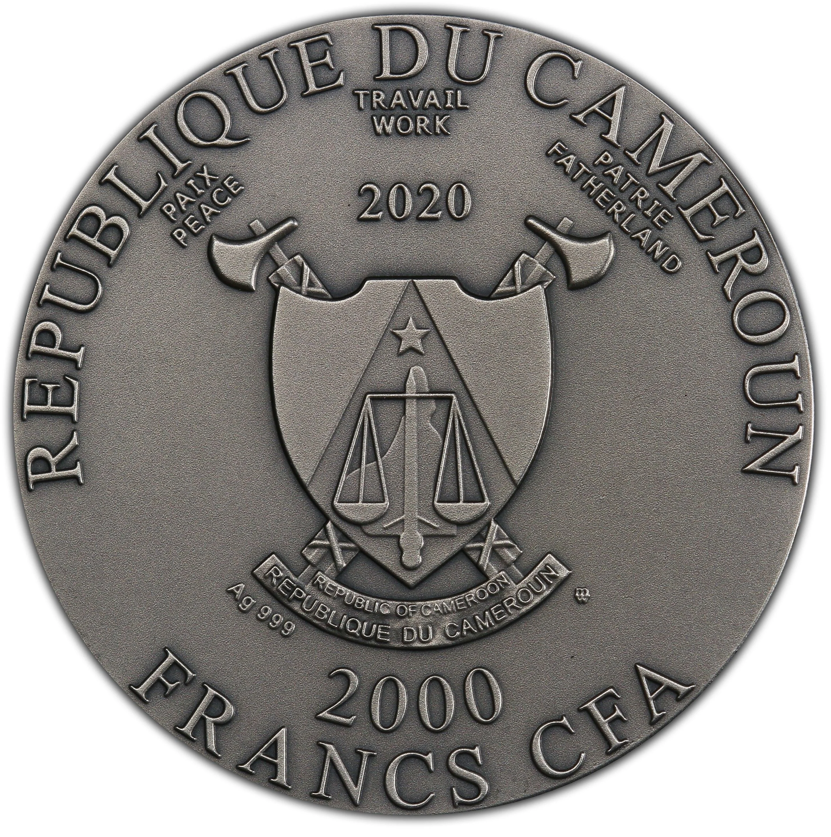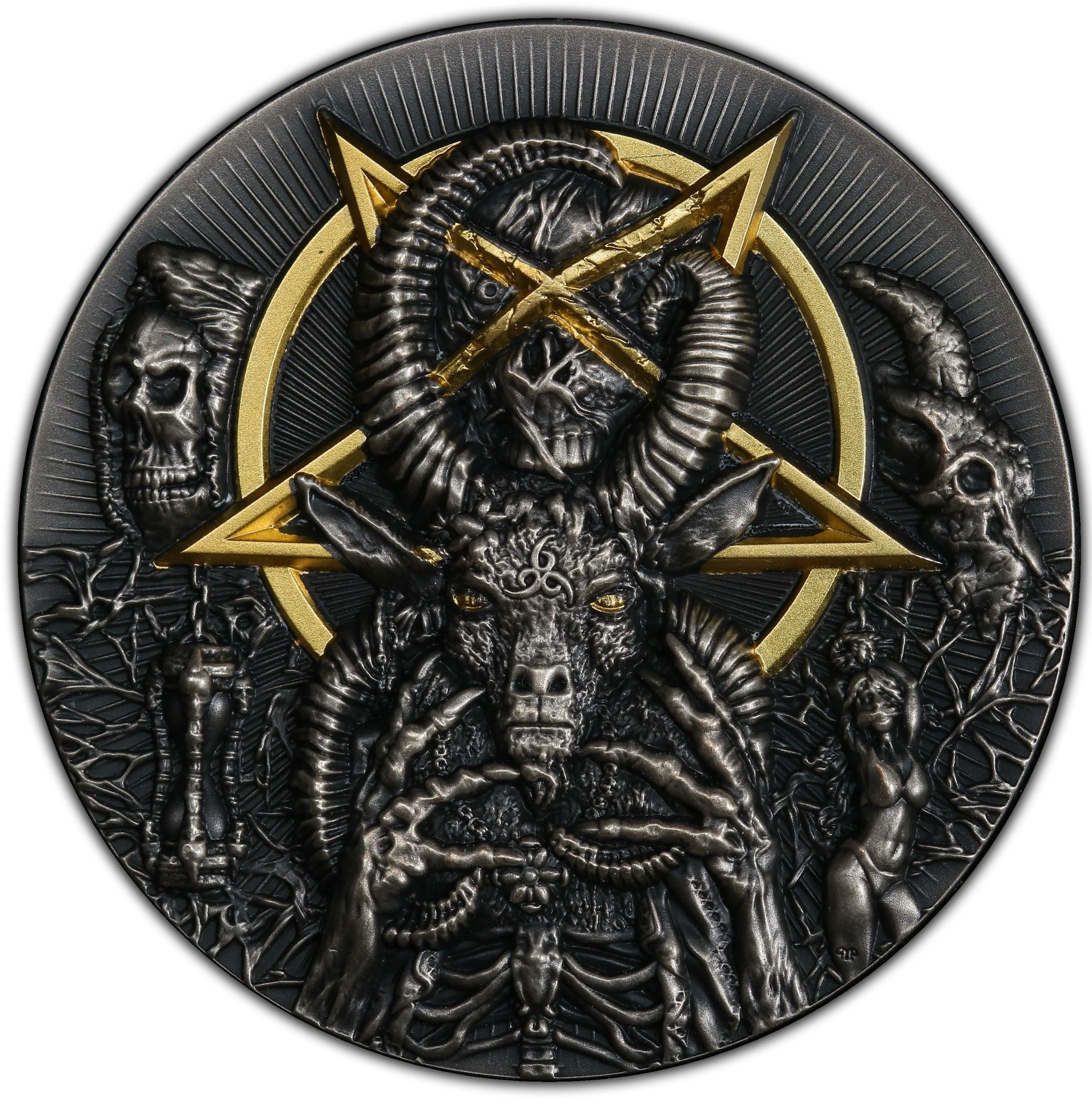 Demon bust facing forward, pentagram above, Death with hourglass at left.