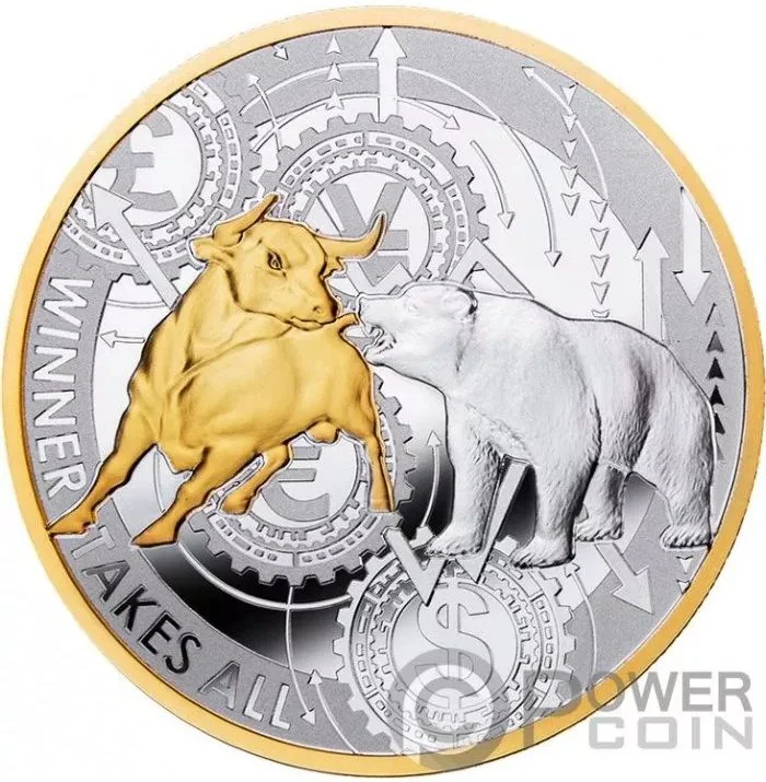 Bull and bear with currency symbols.