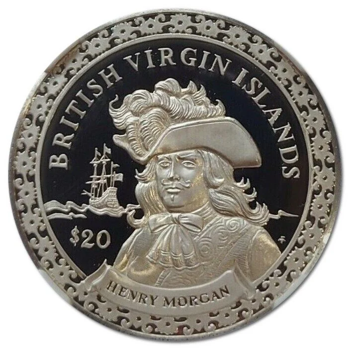 Captain Henry Morgan portrait with ship and patterned value border.