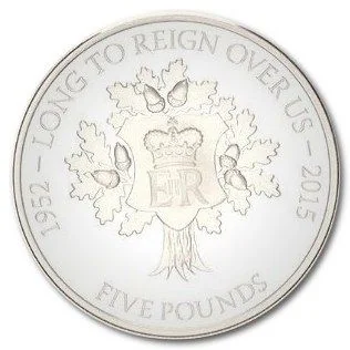 A crown and shield on an oak tree with leaves and acorns, featuring lettering on the shield and around the edge.