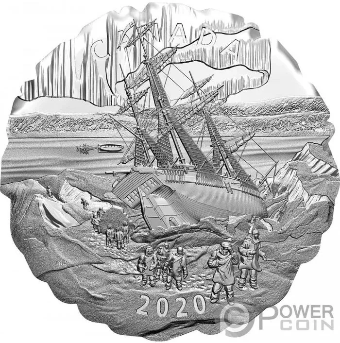 This coin depicts the doomed Franklin expedition. Its jagged, icy edge frames a scene of HMS Terror, abandoned as crew haul a lifeboat toward King William Island.