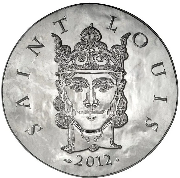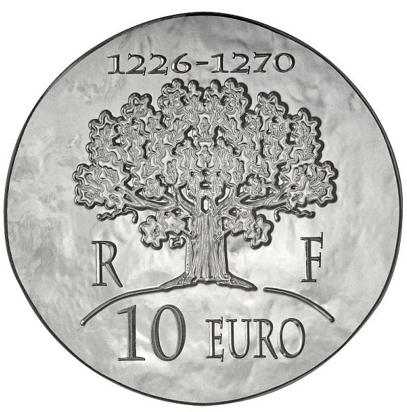 A central oak of justice, topped by Saint-Louis' reign dates "1226-1270" and flanked by "R" and "F" for the French Republic, with the face value "10 EURO" below.