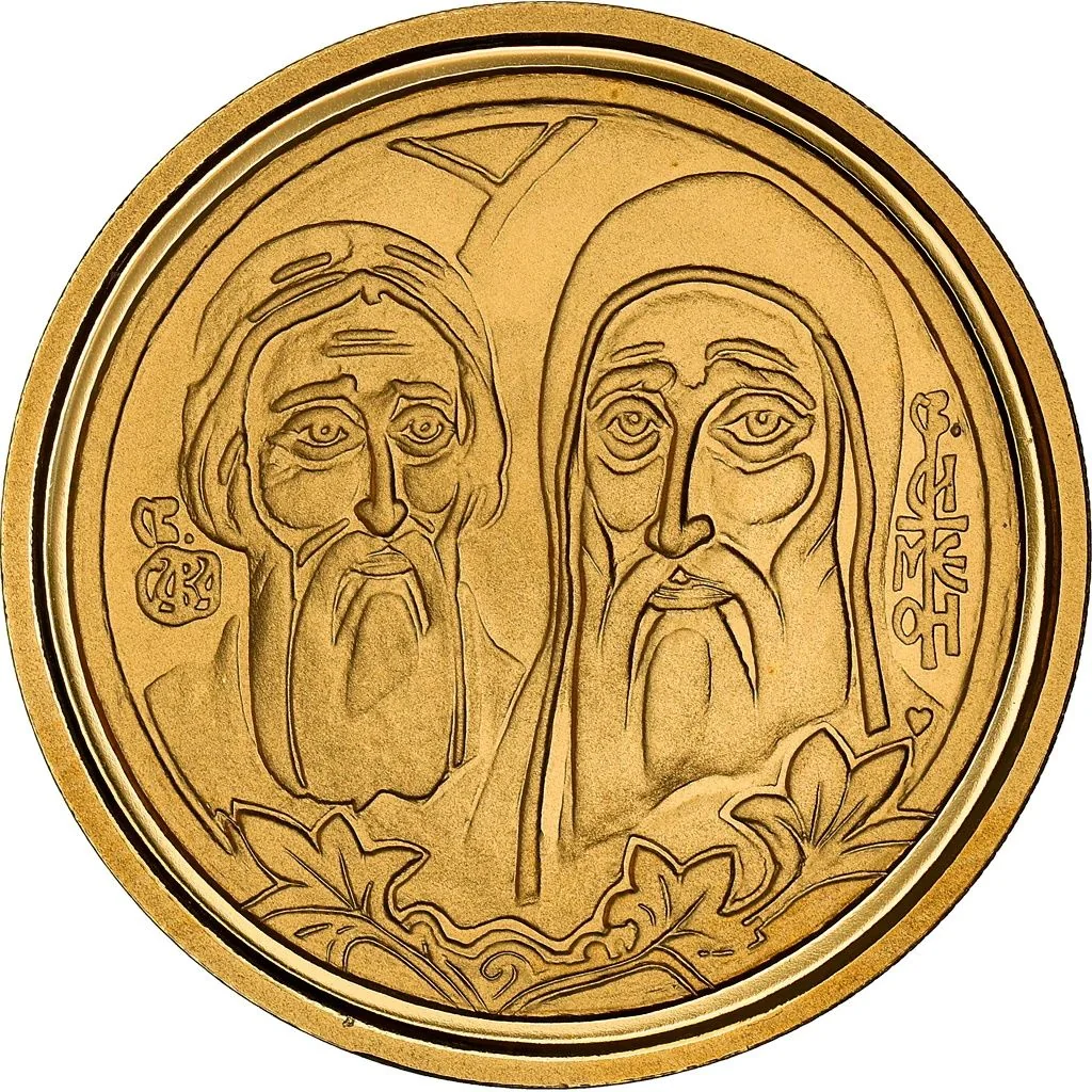 Coat of arms above Chilandar Monastery flanked by anniversary dates, issuer name above, value and date below.