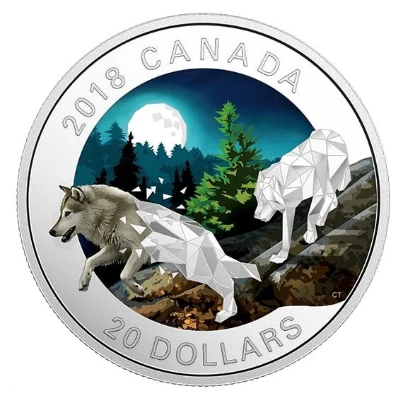 Designed by Claude Thivierge, this coin merges low poly and realistic art styles to depict a grey wolf in a moonlit boreal forest. One wolf, rendered in geometric polygons, appears to leap and transform into a realistic version, creating an illusion of movement and shattered boundaries. Bold colour and textured engraving bring the landscape to life, while the silver surface shows through the wolf designs. The rim is engraved with "CANADA," "20 DOLLARS," and "2018."