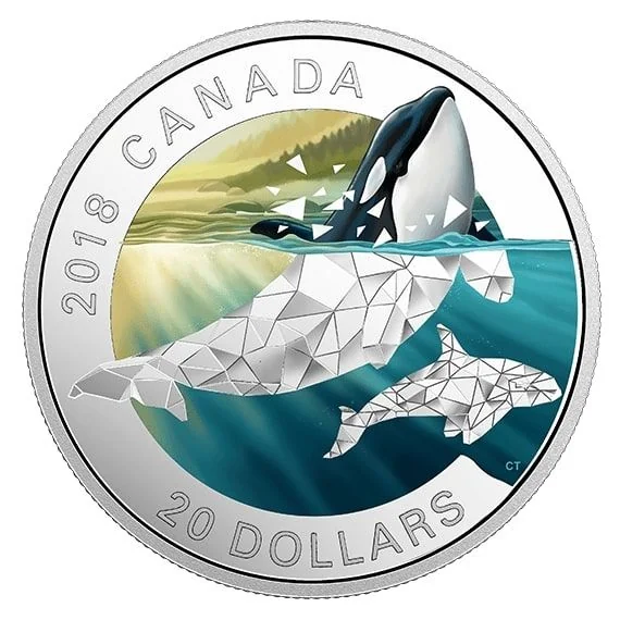 Claude Thivierge’s design merges two art styles to depict a breaching orca. The scene splits between the sunlit Pacific Coast and an underwater realm, where pod members are rendered in low-poly style. As the foremost orca bursts through the surface, its form transitions from geometric abstraction to realism, shattering both the water’s surface and the stylistic divide. The rim is engraved with “CANADA,” “20 DOLLARS,” and “2018.”