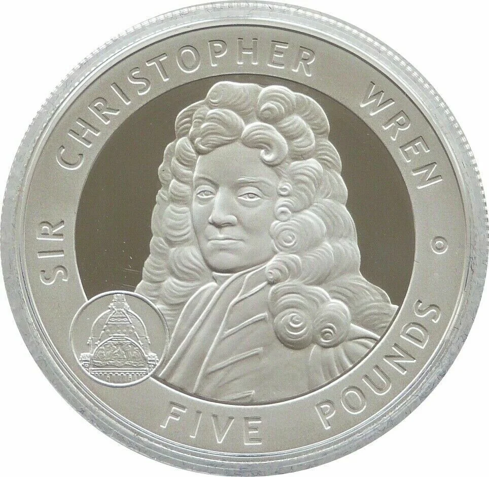 Portrait of Sir Christopher Wren facing left, with St. Paul's Cathedral cameo and denomination below.