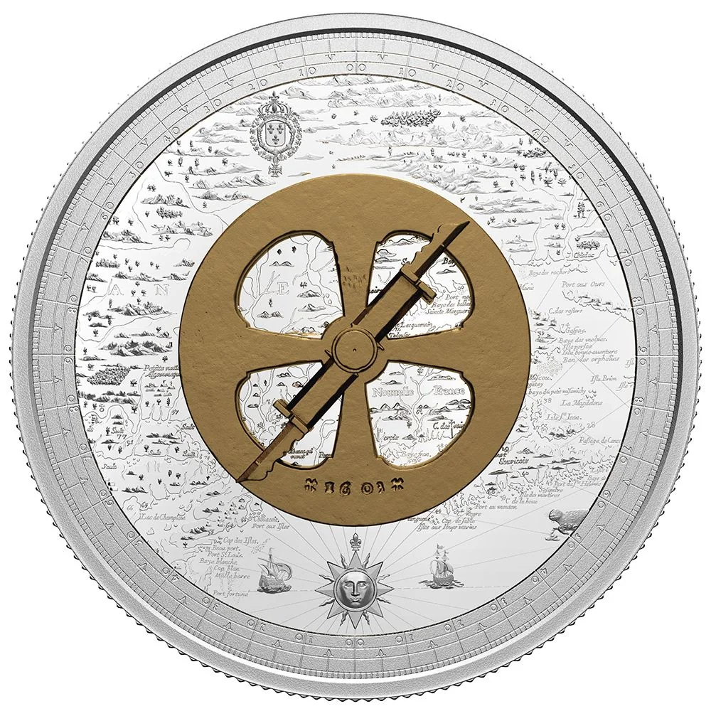 The reverse features a silver and bronze-plated reproduction of a 17th-century mariner's astrolabe, linked to Samuel de Champlain. It is set against an engraved copy of Champlain's 1632 map of New France, framed by the astrolabe's graduated scale.
