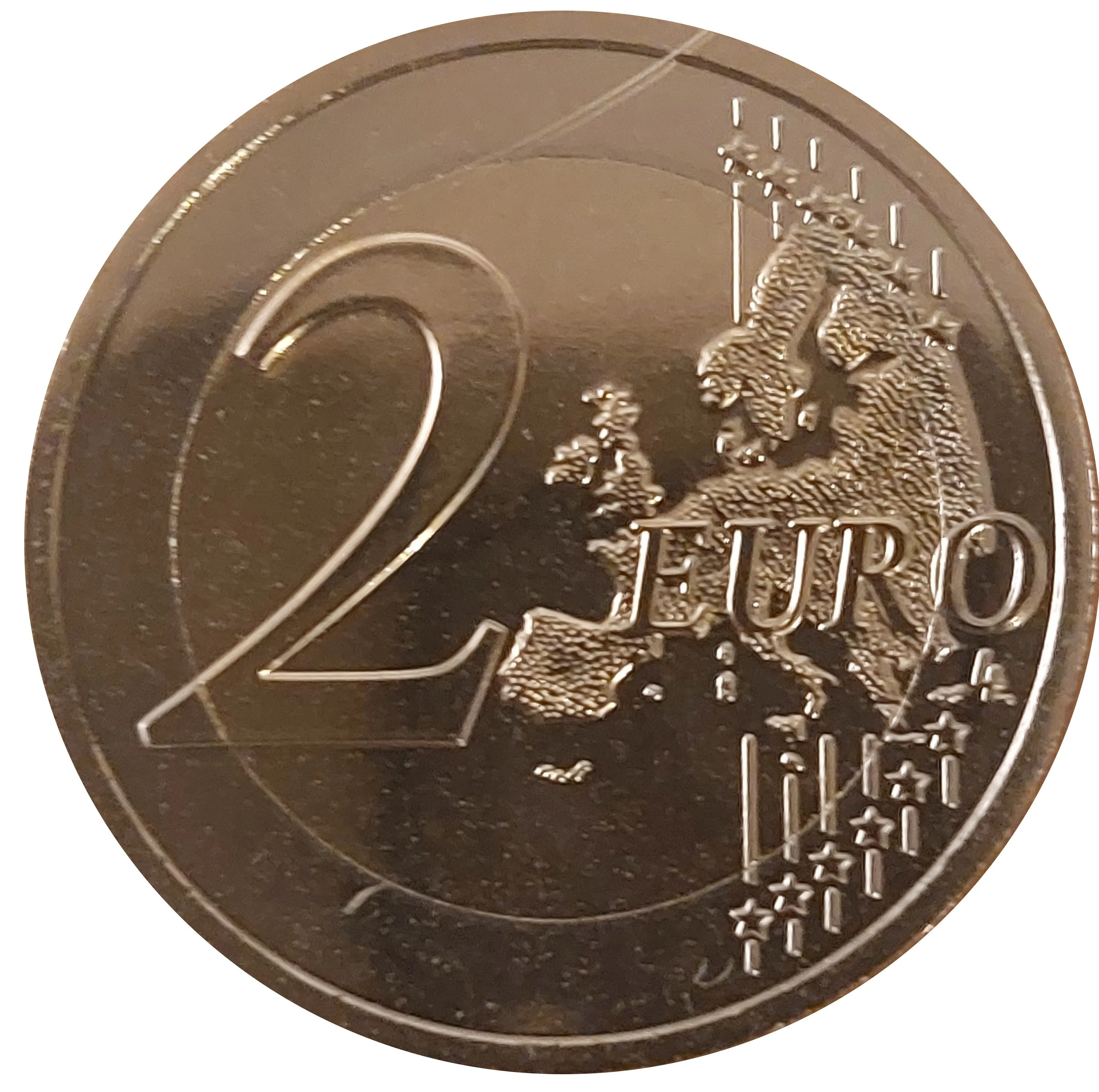 A Western Europe map spans the coin's right side, with "2 EURO" overlaid—the "2" in the Atlantic. Twelve stars flank the map, six above and six below, connected by six vertical stripes across the inner core.