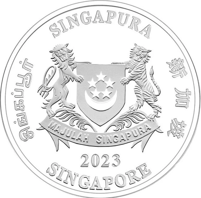 Emblem with date; 'Singapore' encircles it in English, Tamil, Chinese, and Malay.