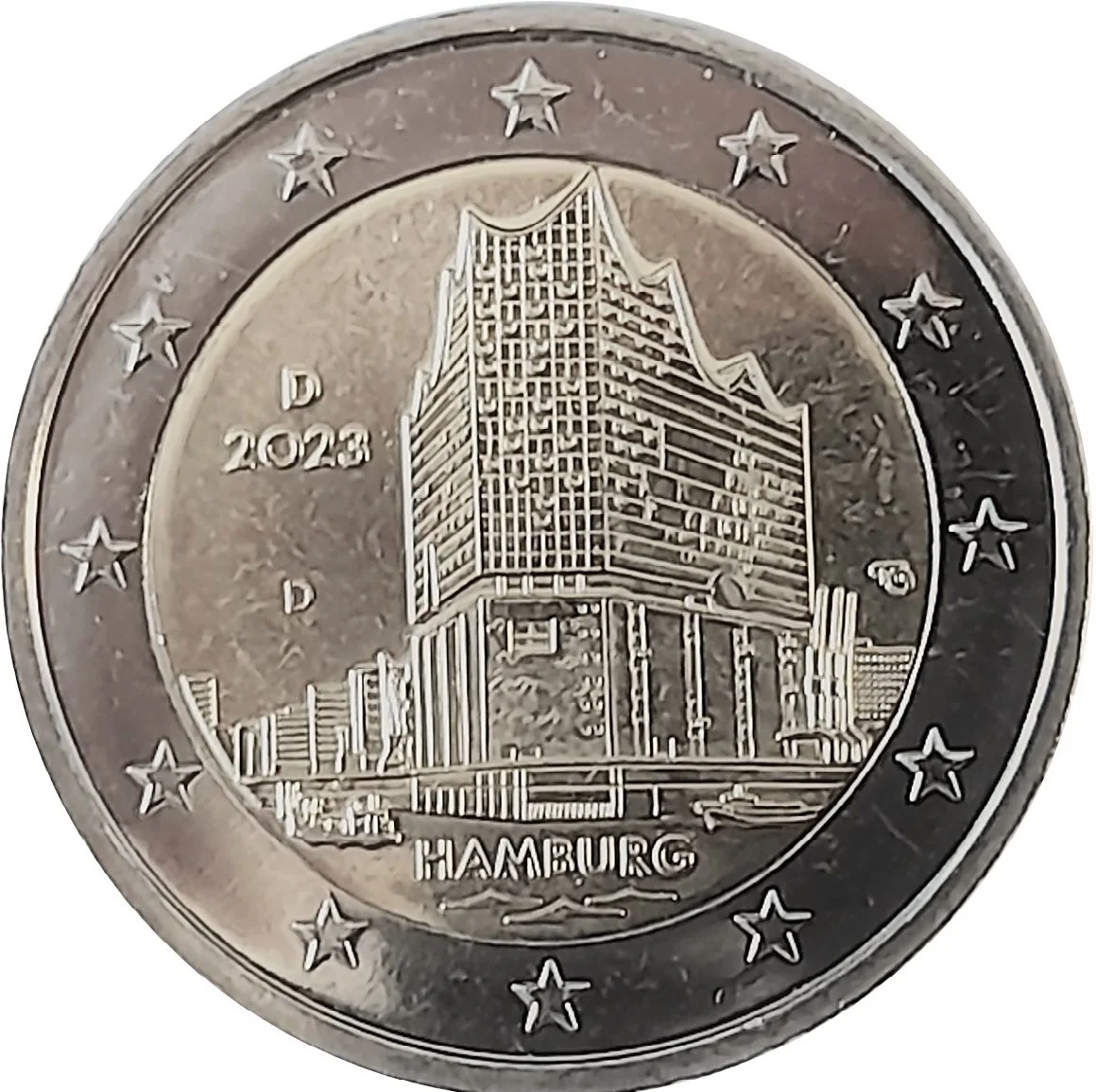 The design features Hamburg's Elbphilharmonie concert hall against its maritime cityscape. The inner left side shows the country code 'D', the year 2023, and a mintmark. The right side has the artist's initials, with 'HAMBURG' below. The outer ring depicts the 12 stars of the European flag.