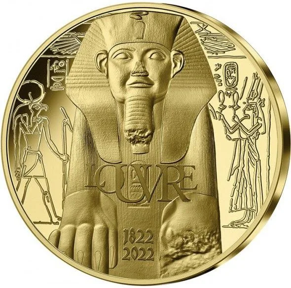 The reverse depicts the Divine Adorer Chépénoupet. A statue of Amun watches over Tutankhamun, whose cartouches appear on a pyramid below. The face value, "RF," and mintmark are at the center.