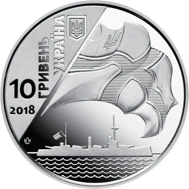 Ukraine's small coat of arms is above, on a matt background. To its left are the inscriptions "УКРАЇНА," "10 ГРИВЕНЬ," and the year 2018. To the right, on a smooth background, are stylized images of the historic naval flag and a sailing warship, with the mint mark to the ship's left.