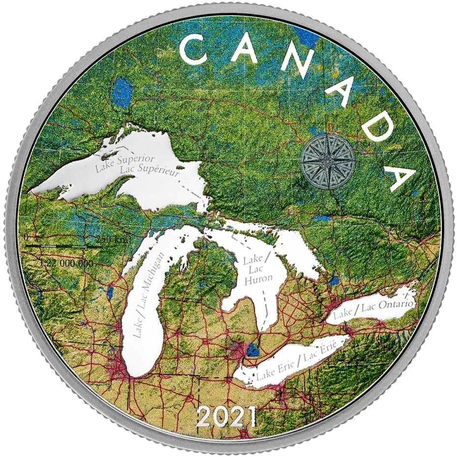 Designed by cartographer Chris Brackley, the coin's reverse features a custom map of the Great Lakes. The lakes have a brilliant silver finish with frosted names. Colours denote land cover: greens for forests, blue/green for wetlands, pink for urban areas, yellow for farmland, and red for roads. A compass rose and engraved graticule lines complete the design.