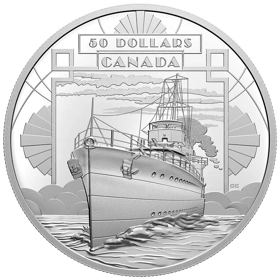 Designed by Glen Green, the reverse features the HMCS Saguenay, an early Royal Canadian Navy warship built in 1931, within art deco elements symbolizing Canada's post-WWI emergence.