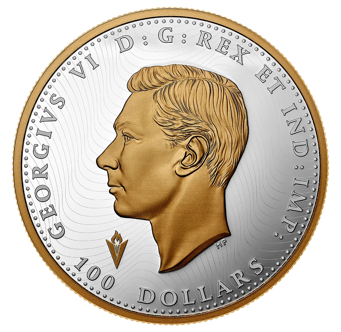 The obverse has a selectively gold-plated effigy of George VI by T.H. Paget and a "V for Victory" privy mark.