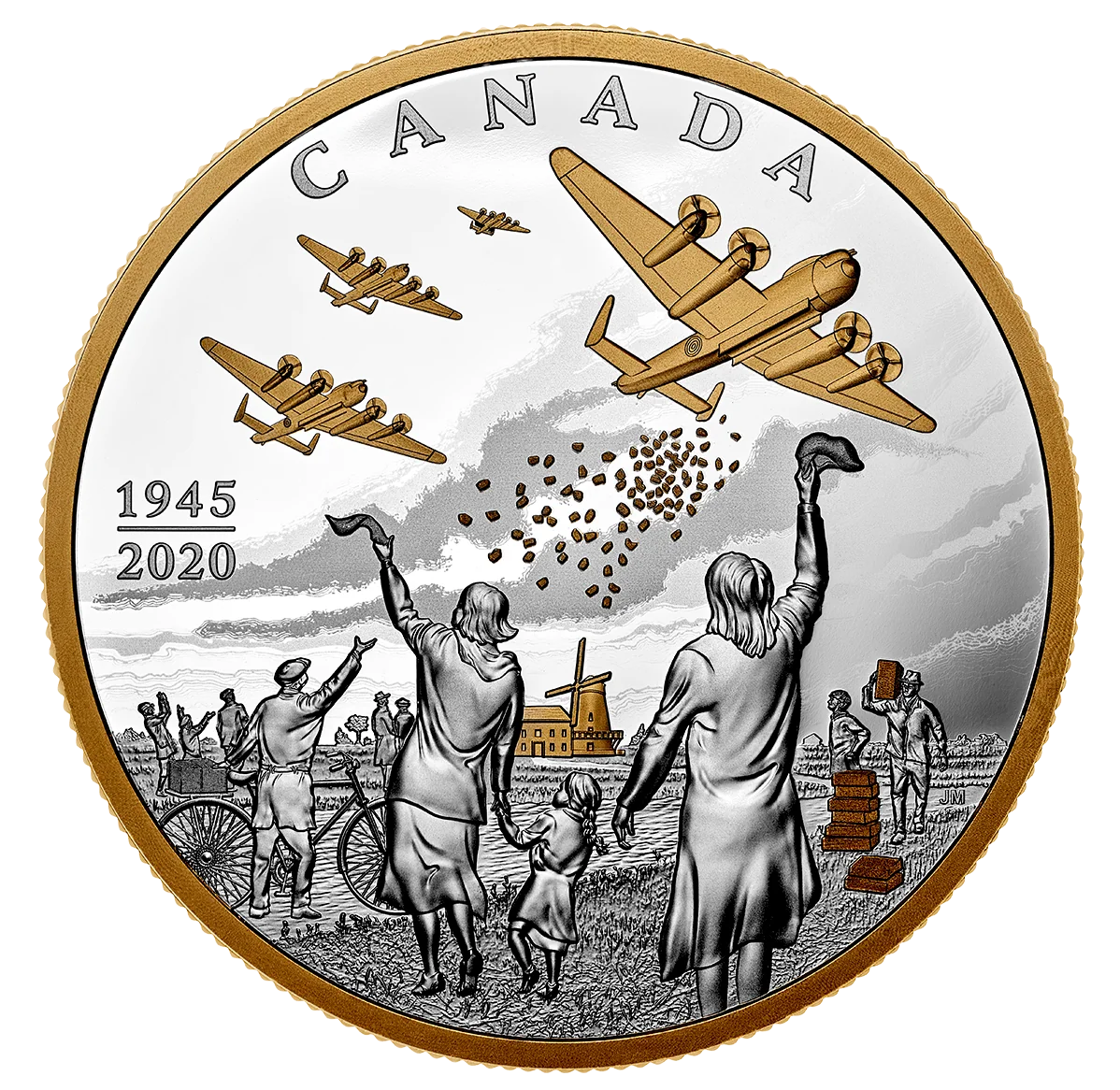 Commemorating the 75th anniversary of the Liberation of the Netherlands, this coin's reverse by John Mantha depicts a Lancaster bomber from Operation Manna dropping supplies to Dutch civilians. Selective gold plating highlights the aircraft, parcels, and a windmill.