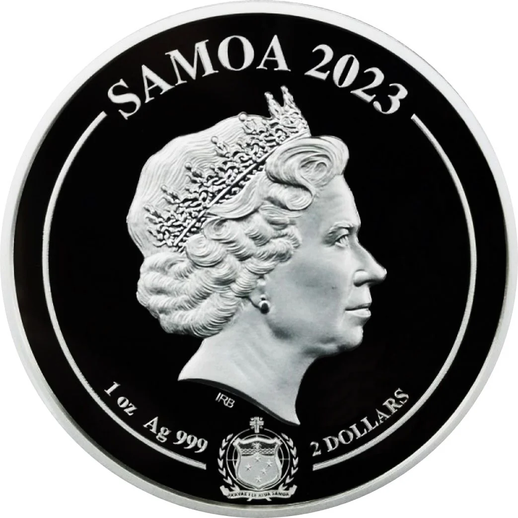 Queen Elizabeth II facing right, Samoa's coat of arms below.